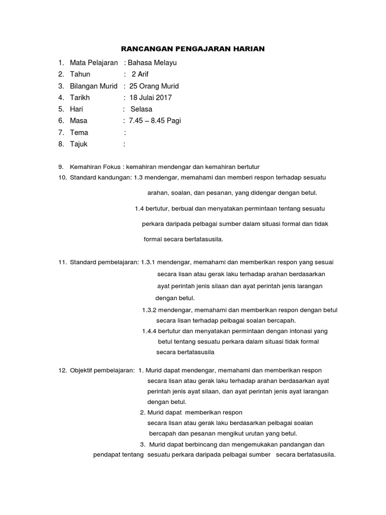 RANCANGAN PENGAJARAN KSSR KEMAHIRAN MENDENGAR DAN BERTUTUR. RANCANGAN PENGAJARAN HARIAN RPH Mata Pelajaran. Ia berlaku setelah si penutur itu dapat mendengar dan memahami dengan baik apa yang didengarnya.